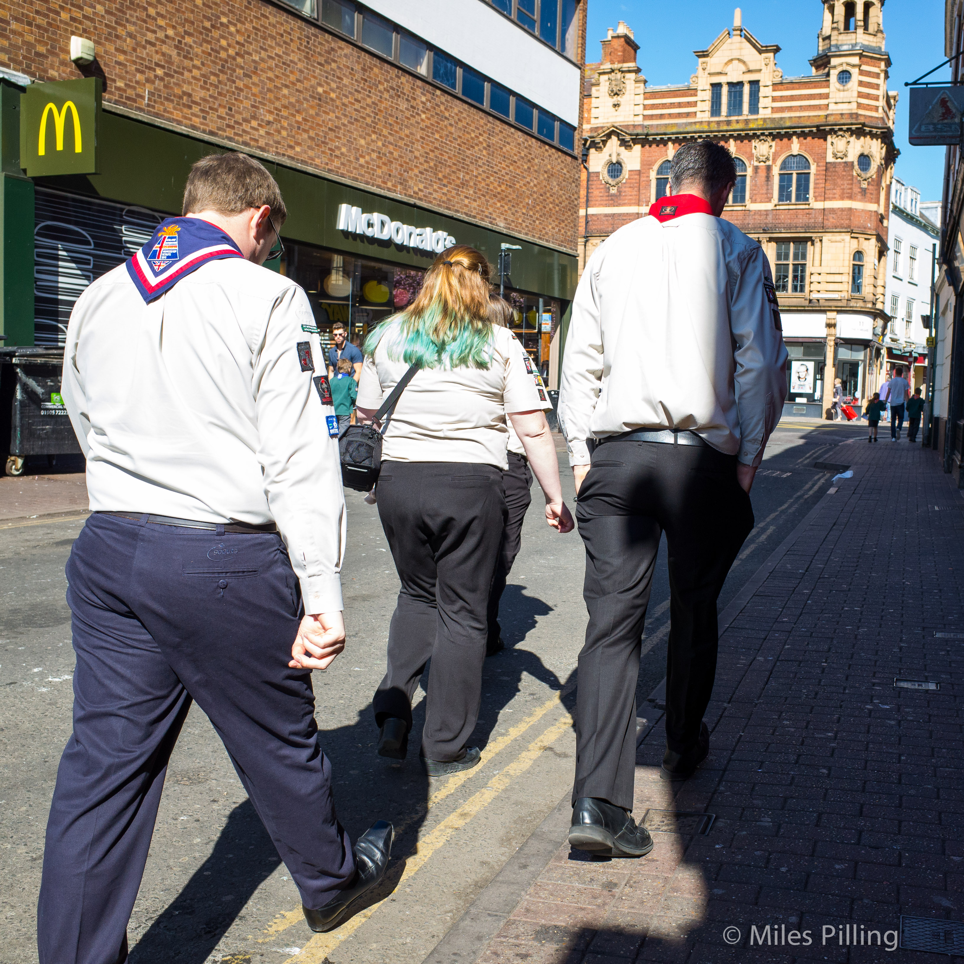 It was the colours that caused me to take the picture, then later I noticed that the girls green hair and the McDonald’s sign echo the colourful neckerchiefs of the two other scouts!