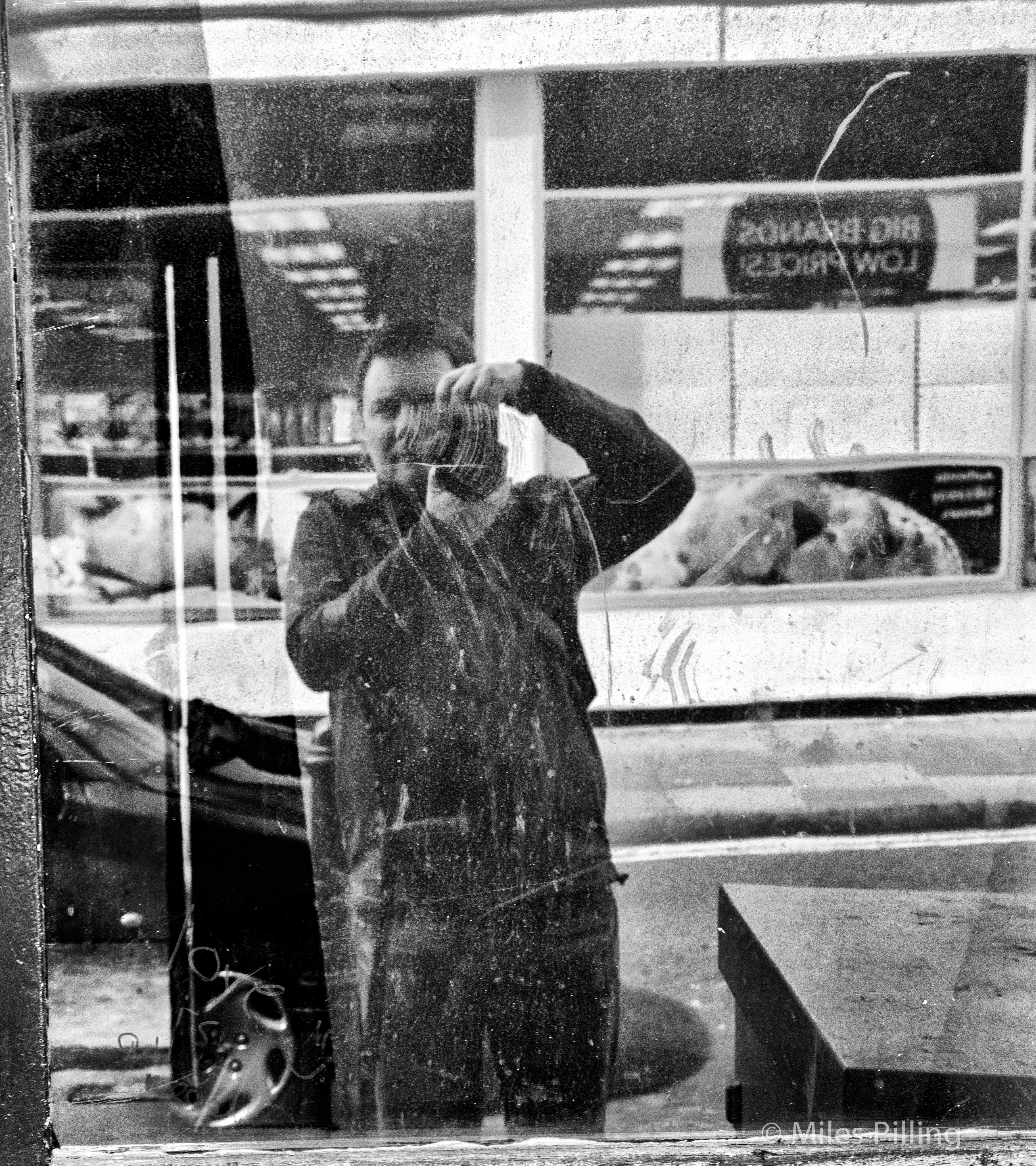 You can just about see the size of my Canon 6D in this “self-portrait with a German crutch”. I like the way the natural borders and distressing from the window have given it an old-fashioned Polaroid look.